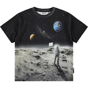 Schwarzes T-Shirt aus weicher Öko-Baumwolle mit kurzen Ärmeln und einem gerippten Ausschnitt. Das T-Shirt hat eine lockere Passform mit einem Druck des Mannes auf dem Mond.