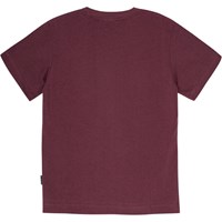 Bordeaux T-Shirt aus Öko-Baumwolle mit kurzen Ärmeln, Rundhalsausschnitt und geripptem Abschluss am Hals. Das T-Shirt hat eine lockere Passform und ein bedrucktes Design auf der Vorderseite. Der Druck vereint Vergangenheit und Zukunft in Form eines Roboter-Dinosauriers, der im Wald nach Freunden sucht. Der Text "More Than Reality" steht unten und verblasst fast aus dem Bild.