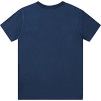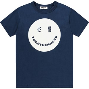 Dunkelblaues T-Shirt aus Öko-Baumwolle mit kurzen Ärmeln, Rundhalsausschnitt und geripptem Abschluss am Hals. Das T-Shirt hat eine lockere Passform und zeigt ein bedrucktes Design auf der Vorderseite. Der Druck zeigt ein lächelndes Gesicht in Weiß mit dem Text "You Me Togetherness".