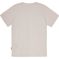 Beiges T-Shirt aus Öko-Baumwolle mit kurzen Ärmeln, Rundhalsausschnitt und geripptem Abschluss am Hals. Das T-Shirt hat eine lockere Passform und ein bedrucktes Design auf der Vorderseite. Der Druck zeigt einen Astronauten, der einen fremden Planeten erkundet, oder vielleicht ist er gar nicht so fremd? Der Text "Out There" ergänzt das Design.