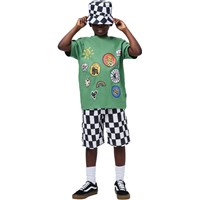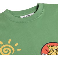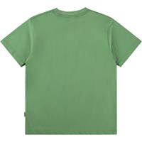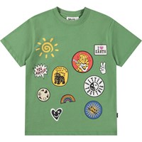 Grünes T-Shirt aus weicher Öko-Baumwolle mit kurzen Ärmeln und geripptem Halsausschnitt. Das T-Shirt hat eine lockere Passform mit kleinen bunten Drucken.
