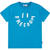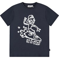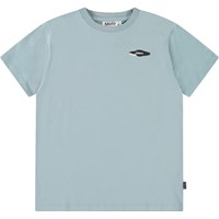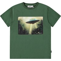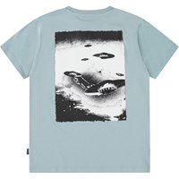 Hellblaues T-Shirt aus weicher Öko-Baumwolle mit kurzen Ärmeln und geripptem Ausschnitt. Das T-Shirt hat eine lockere Passform mit einem schwarz-weißen Frontdruck von fliegenden UFOs.