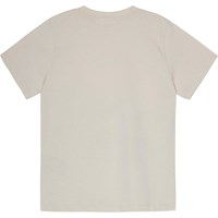 Beiges T-Shirt aus Öko-Baumwolle mit kurzen Ärmeln, Rundhalsausschnitt und geripptem Abschluss am Hals. Das T-Shirt hat eine lockere Passform und einen farbenfrohen Druck auf der Vorderseite. Der Druck vereint Vergangenheit und Zukunft, wo ein Roboter-Dinosaurier und seine Freunde sich an der Tankstelle für einen lustigen Abend treffen.
