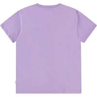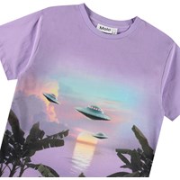 Lila T-Shirt aus weicher Öko-Baumwolle mit kurzen Ärmeln und geripptem Ausschnitt. Das T-Shirt hat eine lockere Passform mit einem Frontdruck eines Sonnenaufgangs, Palmen und UFOs, die über dem Wasser schweben.