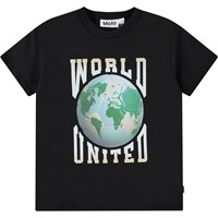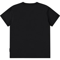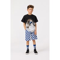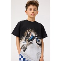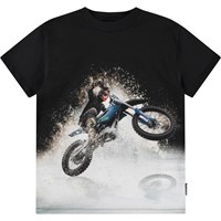 T-Shirt aus weicher Öko-Baumwolle mit kurzen Ärmeln und geripptem Ausschnitt. Das T-Shirt hat eine lockere Passform und einen Frontdruck von spritzendem Wasser und einem Motocross-Fahrer.