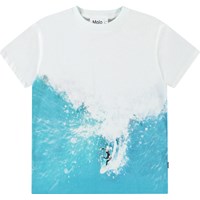 Weißes T-Shirt aus weicher Öko-Baumwolle mit kurzen Ärmeln und geripptem Ausschnitt. Das T-Shirt hat eine lockere Passform und einen Druck eines Surfers auf einer Welle vorne und hinten.