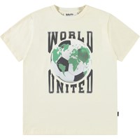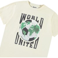 Weißes T-Shirt aus weicher Öko-Baumwolle mit kurzen Ärmeln und geripptem Ausschnitt. Das T-Shirt hat eine lockere Passform und einen Frontdruck eines Fußballs mit einem Druck der Weltkarte und dem Text "World United".