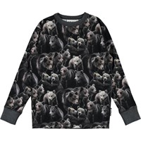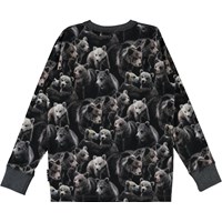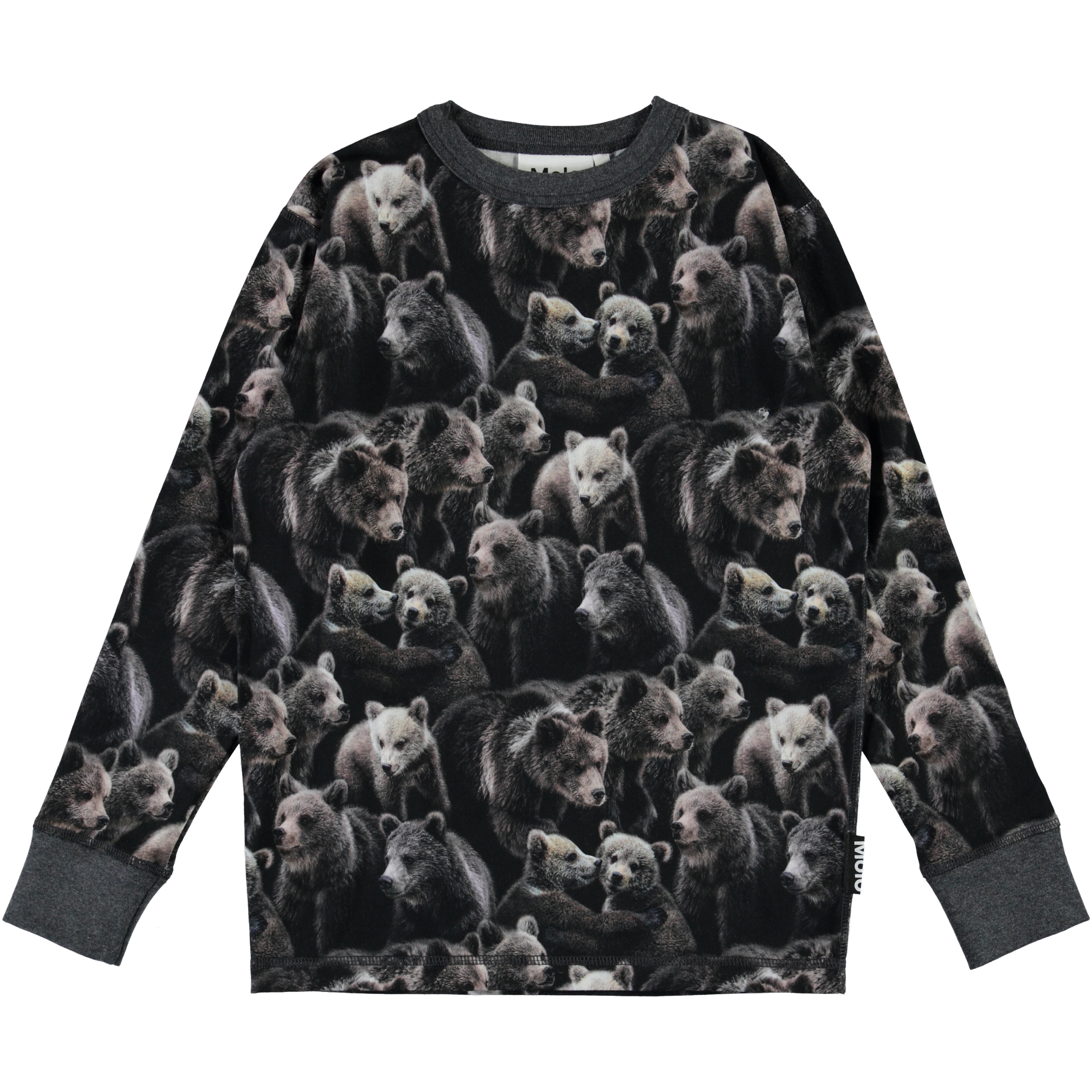 Das langärmelige T-Shirt Rill hat einen All-over-Druck von einer großen Bärenherde mit großen und kleinen Bären. Rill hat eine dunkelgrau Kantenband am Halsausschnitt sowie eine dunkelgraue Rippkante an den Ärmeln.