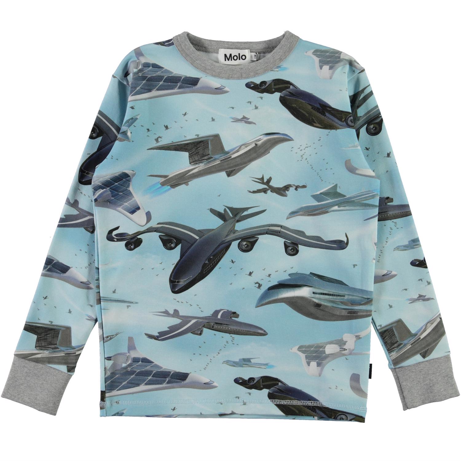 Rill ist ein langärmeliges hellblaues T-Shirt mit Flugzeugdruck. Rill hat ein hellgraues Kantenband am Halsausschnitt und an den Ärmeln.