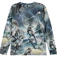 Bluse in Blautönen aus Öko-Baumwolle mit langen Ärmeln, gerippten Bündchen und geripptem Ausschnitt. Die Bluse hat eine normale Passform und ein Allover-Muster, das eine Vielzahl von Dinosauriern zeigt, die auf ihrem eigenen Planeten leben.