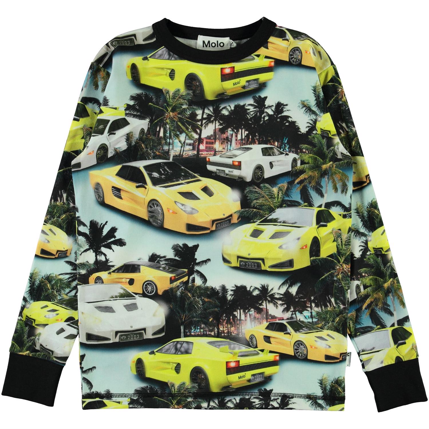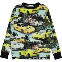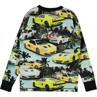 Rill ist ein langärmliges T-Shirt mit Druck von schnellen Autos und Palmen auf einem hellblauen Hintergrund. Rill hat schwarze Kantenbänder am Halsausschnitt und schwarze Rippkanten and den Ärmeln. Ecocert Greenlife, certifikationsnr. 197496.