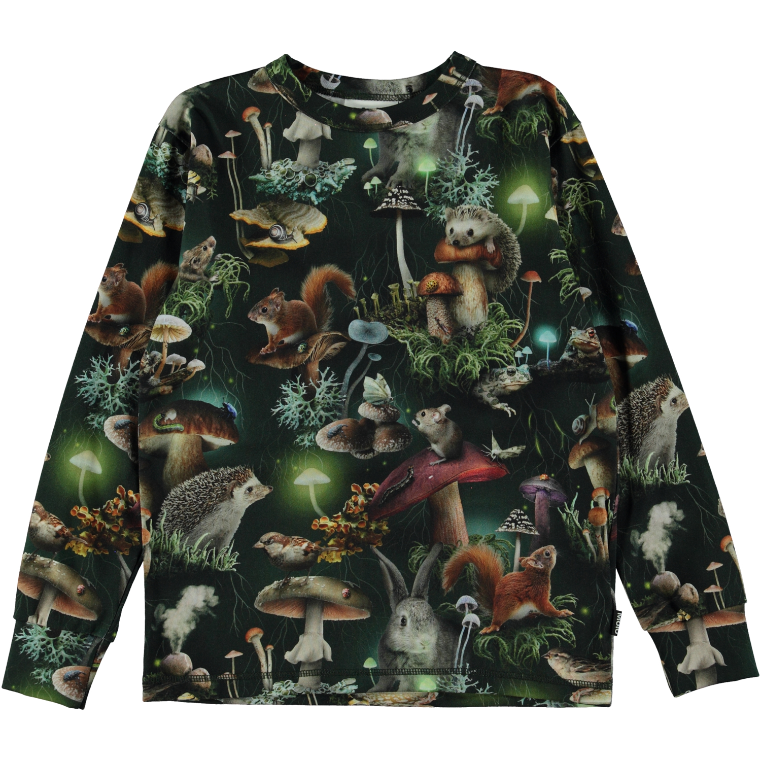 Grünes Langarm-T-Shirt mit Allover-Print. Der Druck zeigt die lustige Zeit im Wald, wo kleine Nagetiere und andere kleine Krabbeltiere in der Dämmerung zwischen Pilzen herumlaufen, nur beleuchtet von den ökolumineszierenden Pilzen. Die Leuchtpilze sind wie kleine Leuchtlämpchen im dunklen Waldboden. Dieses T-Shirt besteht aus 100% Baumwolle, hat einen Rundhalsausschnitt mit gerippten langen Ärmeln, breiten gerippten Bündchen und normaler Passform.