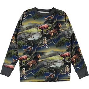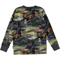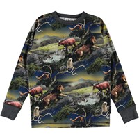 Auf dem langärmeligen T-Shirt Rill sind wir mit dem Druck 'Future Animals' in die Zukunft  gereist, bei dem die Tiere nicht mehr ganz wie sie selbst aussehen. Rill hat ein dunkelgraues Kantenband am Halsausschnitt sowie eine dunkelgraue Rippkante an den Ärmeln.