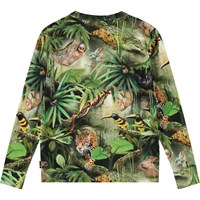Langärmeliges Oberteil aus weicher Öko-Baumwolle mit geripptem Besatz am Hals und an den Ärmeln. Das Oberteil hat eine normale Passform und einen bunten Druck eines üppigen Dschungels und seiner vielen Tiere.