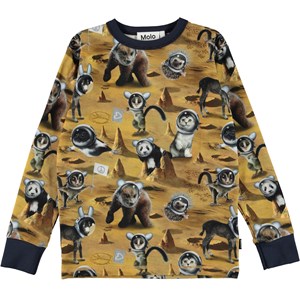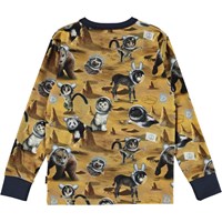 Rill ist ein braunes Langarmshirt mit Prints verschiedener Tiere auf dem Mond. Das Shirt hat einen dunkelblauen gerippten Ausschnitt und Bündchen.