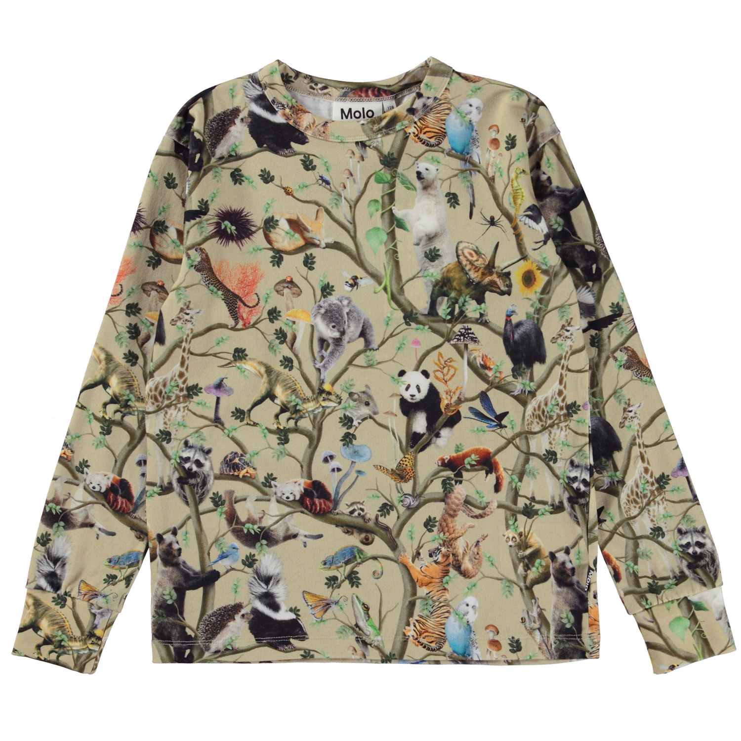 Beiges Langarm-T-Shirt mit Allover-Tiere-Print. Der Druck zeigt alle Arten von Tieren im Baum des Lebens. Sie erzählen die Geschichte, wie wir alle auf der Welt meiterander verbunden sind. Wie die Wurzeln von Bäumen sind Pilze und Vögel, Bäume und Bären, groß und klein, miteinander verbunden sind, und dass wir uns alle umeinander kümmern mussen. Dieses langärmeliges T-Shirt besteht aus 100% Öko-Baumwolle, hat einen Rundhalsausschnitt mit Rippbündchen, Rippbündchen am Armel und eine normale Passform.