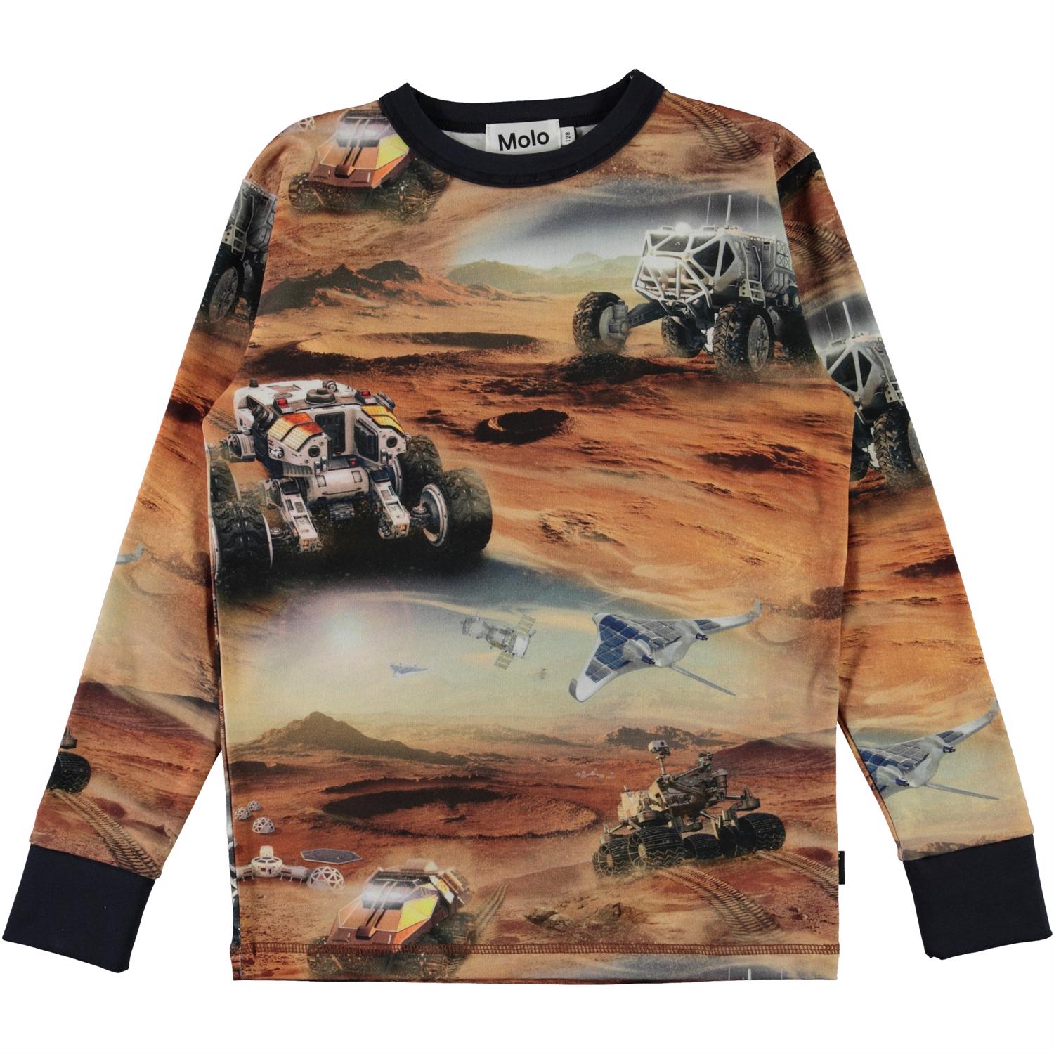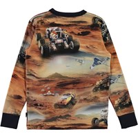 Rill ist ein langärmeliges T-Shirt mit einem Allover-Print vom Mars. Rill hat ein schwarzes Kantenband am Halsausschnitt und an den Ärmeln.