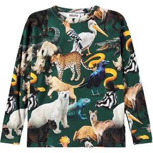 Mehrfarbige Bluse aus Öko-Baumwolle mit langen Ärmeln, gerippten Bündchen und geripptem Ausschnitt. Die Bluse hat eine normale Passform und ein Allover-Muster verschiedener Tiere auf grünem Hintergrund.