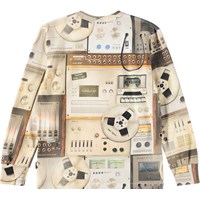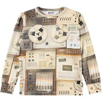 Langärmliges Oberteil aus weicher Öko-Baumwolle mit gerippten Kanten an Hals und Ärmeln. Das Oberteil hat eine normale Passform mit einem bräunlichen Druck von alten Mischpulten.