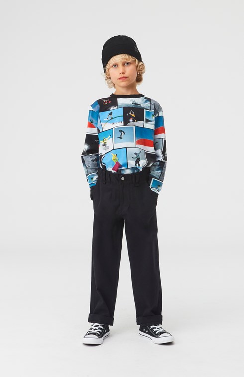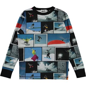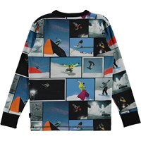 Rill ist ein langärmeliges blaues T-Shirt mit Allover-Print von coolen Snowboardern. Rill hat ein schwarzes Kantenband am Halsausschnitt und an den Ärmeln.