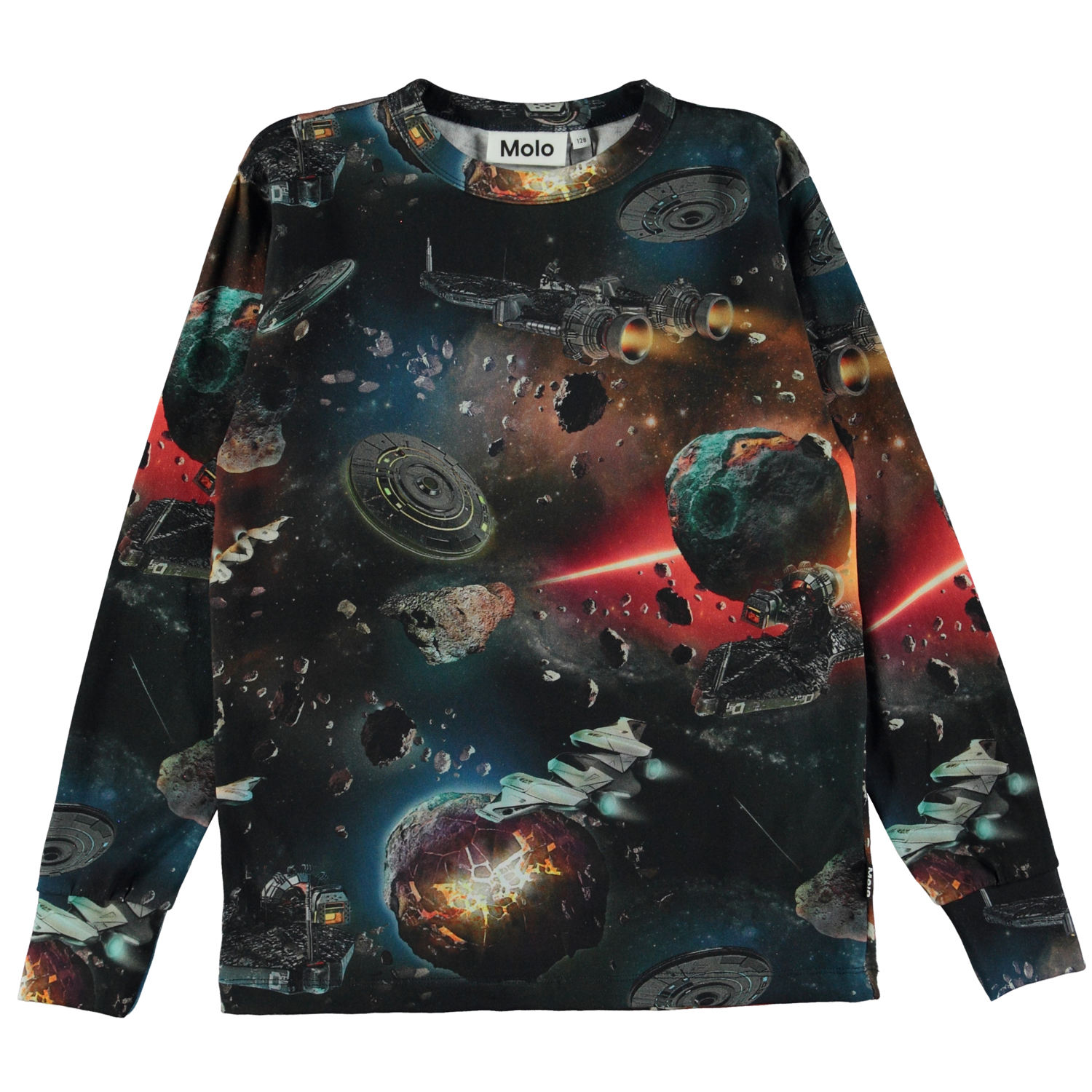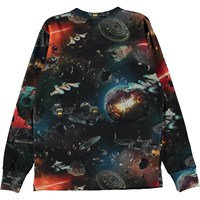 Schwarz-dunkelblaues Langarm-T-Shirt mit Allover Space Print im Retro-Look. Der Weltraum ist voller heller, wilder Farben und voller Spaß. Hier folgen wir abenteuerlustigen Raumschiffen und UFOs, die in Asteroidengürteln nach neuen Abenteuern suchen. Dieses T-Shirt besteht aus 100% Baumwolle, hat einen Rundhalsausschnitt mit gerippten langen Ärmeln, breiten gerippten Bündchen und normaler Passform.