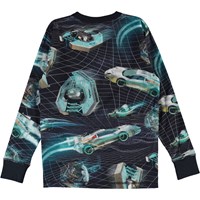 Rill ist ein blaues langärmeliges T-Shirt mit einem 'Time Machine' Druck. Rill hat ein dunkelblaues Kantenband am Halsausschnitt sowie eine dunkelblaue Rippkante an den Ärmeln.