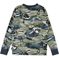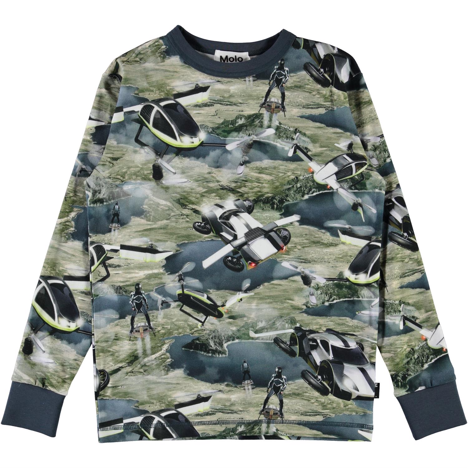 Rill ist ein langärmliges T-Shirt mit Druck von fliegenden Autos der Zukunft. Rill hat blaue Kantenbänder am Halsausschnitt und blaue Rippkanten an den Ärmeln. Ecocert Greenlife, certifikationsnr. 197496.