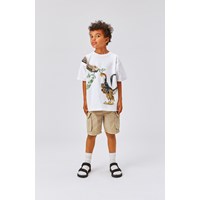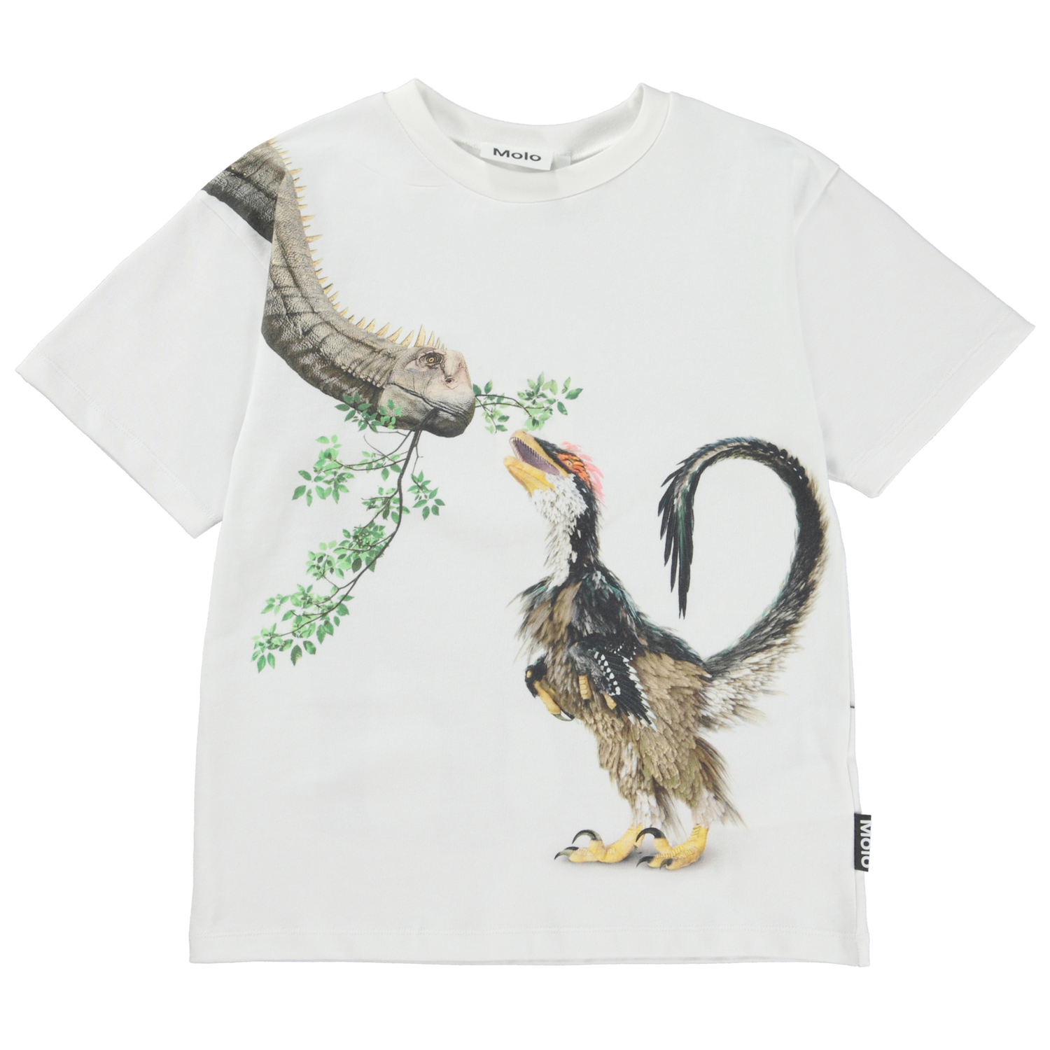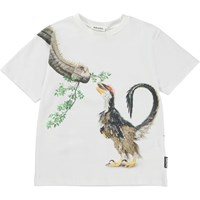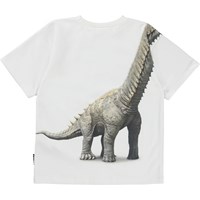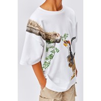 Rillo ist ein weißes T-Shirt mit einem Aufdruck von zwei verschiedenen Dinosauriern, die sich treffen und etwas essen. Das T-Shirt hat eine übergroße Passform und eine drop-down Schulter.