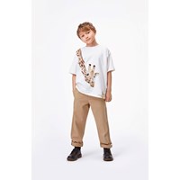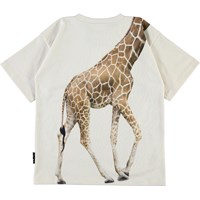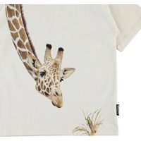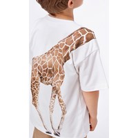 Rillo ist ein weißes oversized T-Shirt mit einer süßen Giraffe, die den Kopf nach unten beugt um eine Heuschrecke zu begrüßen. Auf der Rückseite können Sie den Rest des Giraffenkörper sehen. Ecocert Greenlife, certifikationsnr. 197496.