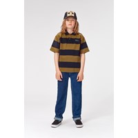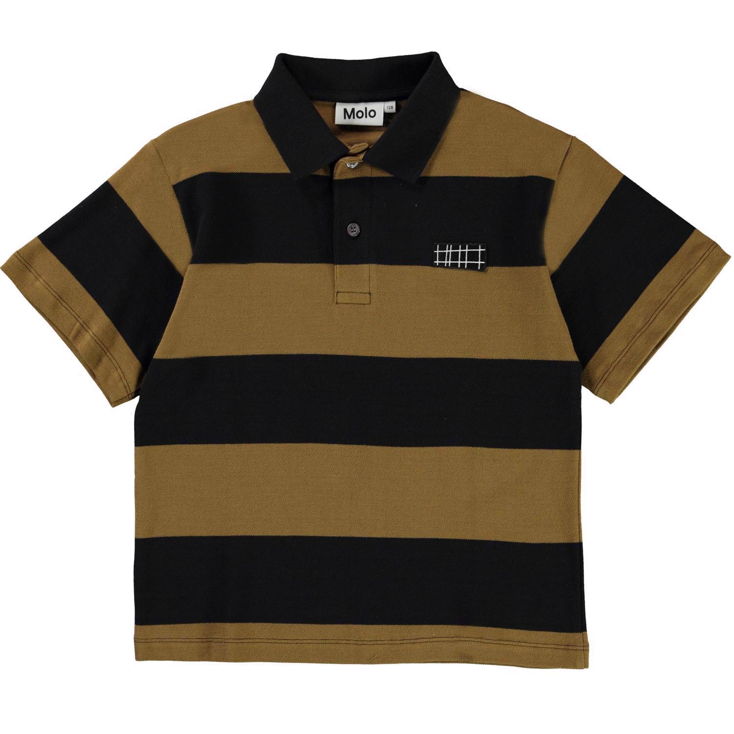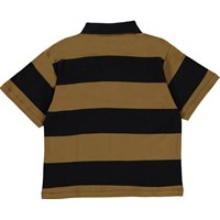 Rilloz ist ein Polo-T-Shirt mit schwarzem Kragen und breiten Streifen in Braun und Schwarz.