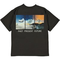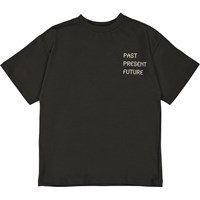 Rilly ist ein dunkelbraunes T-Shirt mit einem leichtem Oversize-Look und dem Text 'Past, present, future' auf der Vorderseite des T-Shirts. Auf der Rückseite des T-Shirts ist ein Druck von die Zeitreisen in die Vergangenheit, Gegenwart und Zukunft.