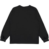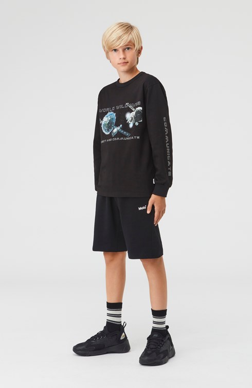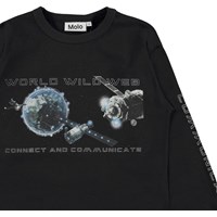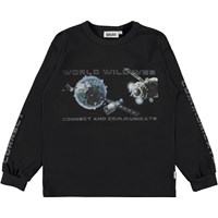 Rin ist ein schwarzer Langarmpullover mit einem Aufdruck von Satelliten auf der Vorderseite mit dem Text 'World Wild Web' sowie einem Text auf den Ärmeln.