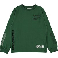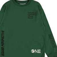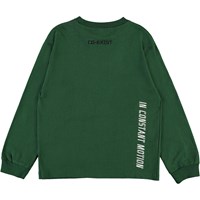 Rin ist ein dunkelgrüner Langarmpullover mit gestickten Text auf der Vorder- und Rückseite.
