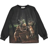 Rin ist ein schwarzes Langarmshirt mit Aufdrucken eines Bären, eines Eichhörnchens und zweier roter Hirsche, die im Wald tanzen.