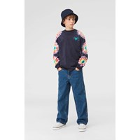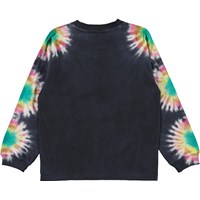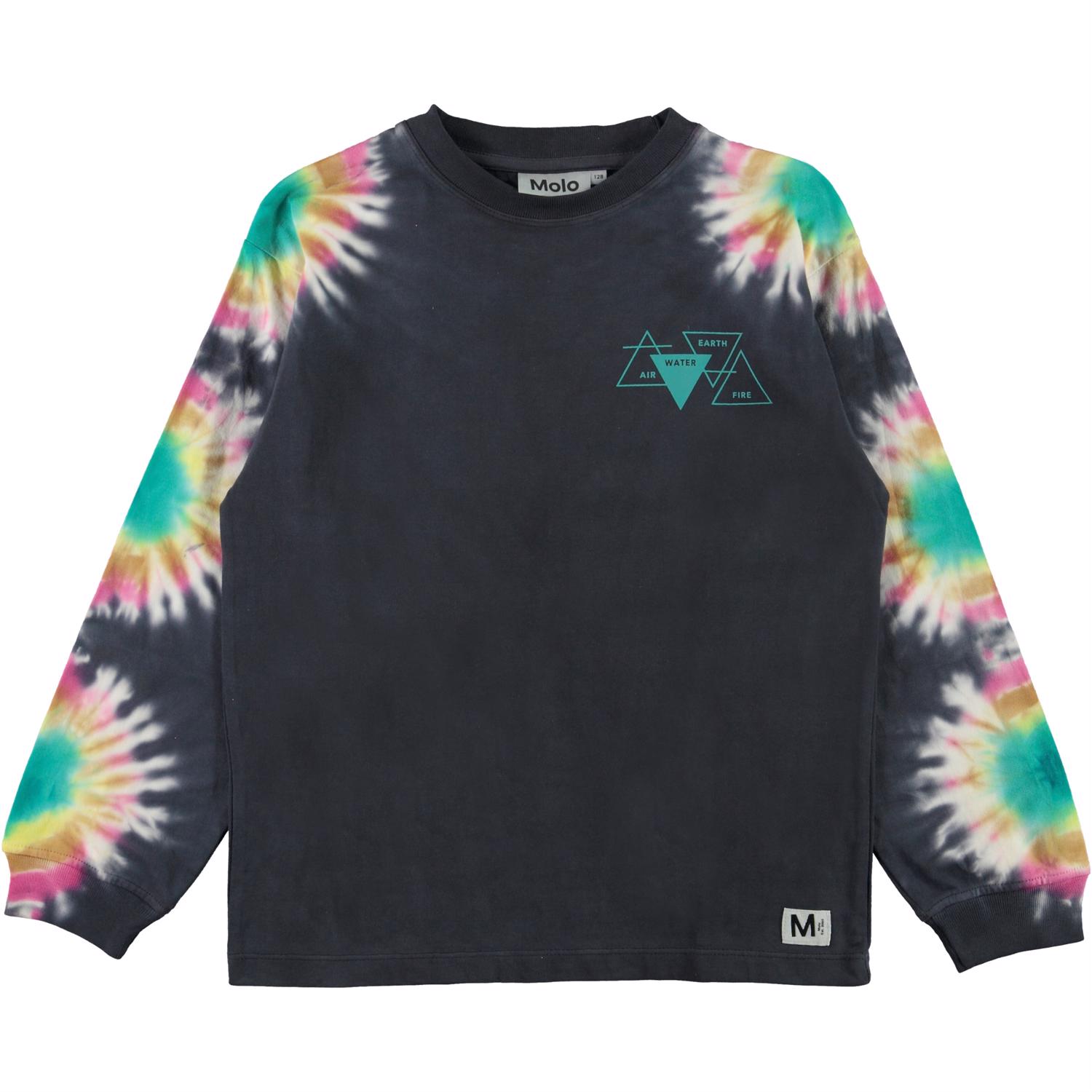 Rin ist ein blauer Langarmpullover mit einem farbenfrohen Batikdruck auf Schultern und Ärmeln.