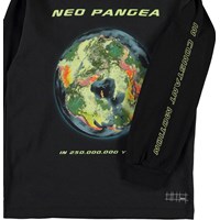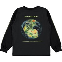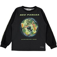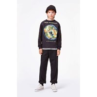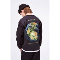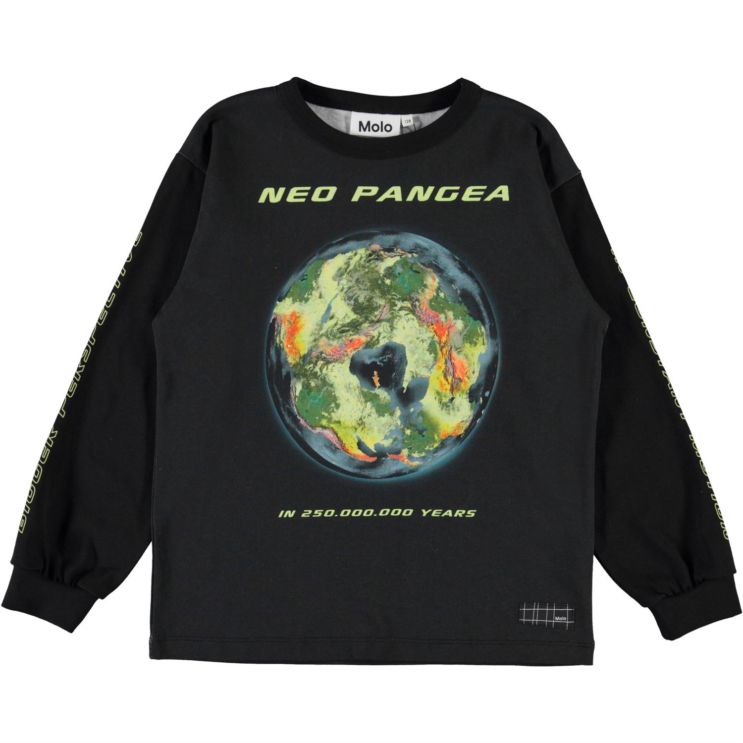 Rin ist ein schwarzer Langarmpullover mit Druck von der Erde auf der Vorderseite und aufgedrucktem Text 'Bigger perspektive' auf beiden Ärmeln. Ecocert Greenlife, certifikationsnr. 197496.