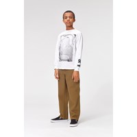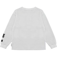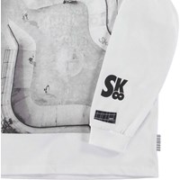 Rin ist ein weißes Langarm-T-Shirt, mit dem Aufdruck "Skate Bowl" auf der Brust. Hier ist eine Skaterampe von oben und unten am linken Ärmel befindet sich ein SK8-Print und ein Logo.
