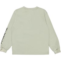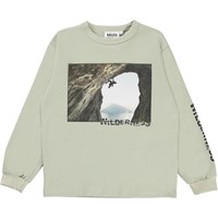 Rin ist ein beiges Langarmshirt mit einem Aufdruck eines Bergsteigers und dem Text „Wilderness“ auf der Vorderseite und einem Ärmel.