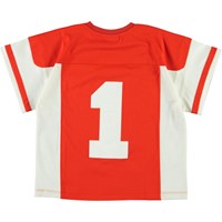 Ritter ist ein rot-weißes T-Shirt mit Sportreferenzen. Ritter hat eine breite und lockere Passform mit dem Aufdruck "Together we are 1" auf der Vorderseite.