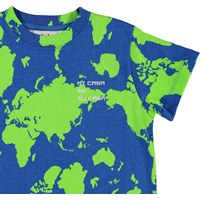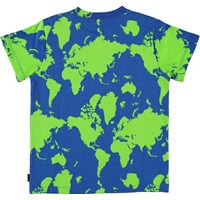 Road ist ein T-Shirt mit Aufdruck auf der Weltkarte in blau und grün und der Formulierung 'Mi casa es su casa' auf der Brust.  Ecocert Greenlife, certifikationsnr. 197496.