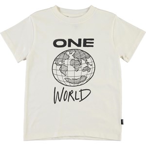 Road ist ein weißes T-Shirt mit aufgedrucktem 'One world' auf der Vorderseite. Ecocert Greenlife, certifikationsnr. 197496.