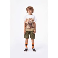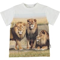 Road ist ein weißes T-Shirt, wo der Druck dich auf einen Spaziergang auf der Savanne mitnehmt, die die Heimat von Löwen ist. Hier sind drei große Löwen auf der Vorderseite des T-Shirts versammelt. Ecocert Greenlife, certifikationsnr. 197496.