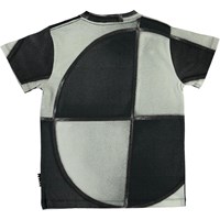 Road ist ein schwarz und weißes T-Shirt mit Druck von der Struktur eines Basketballs.