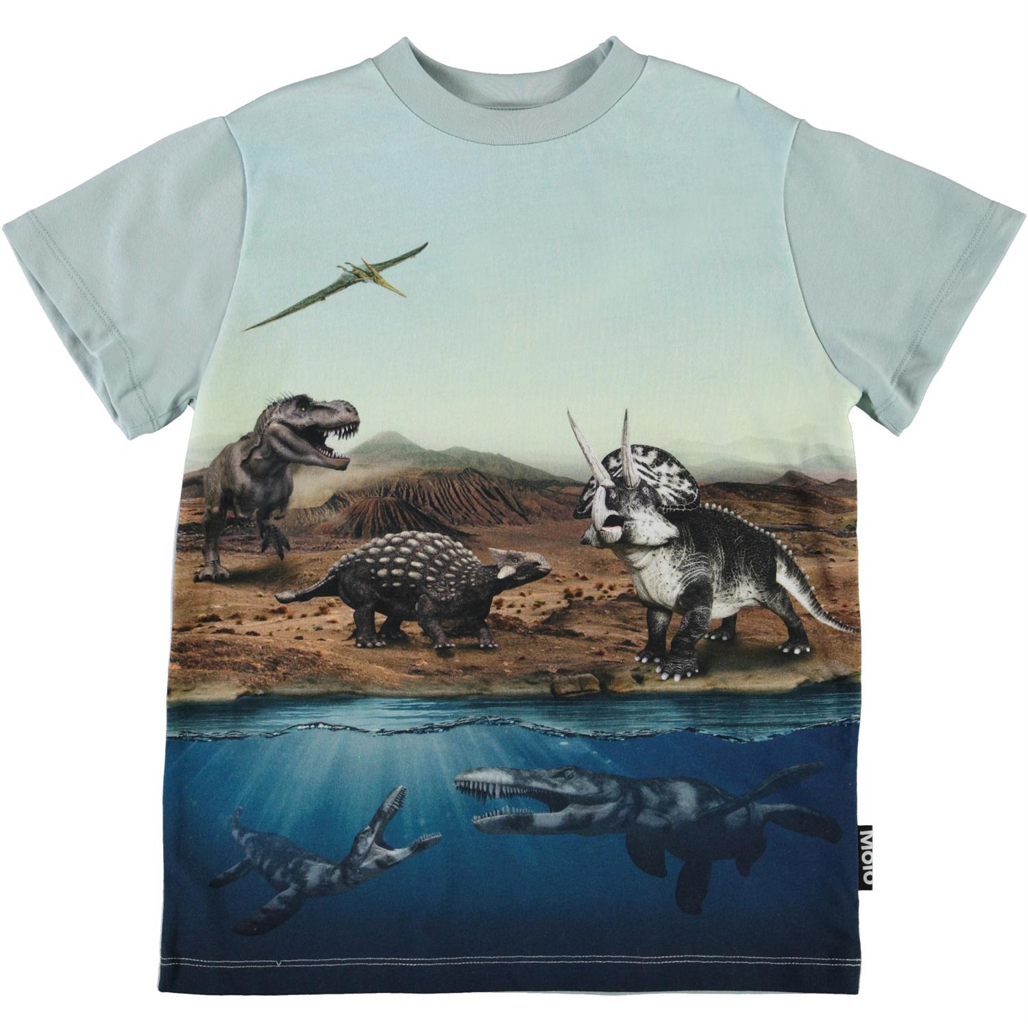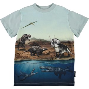 Road ist ein hellblaues T-Shirt mit Druck von Dinosauriern der Vergangenheit, sowohl über als auch unter dem Wasser. Ecocert Greenlife, certifikationsnr. 197496.