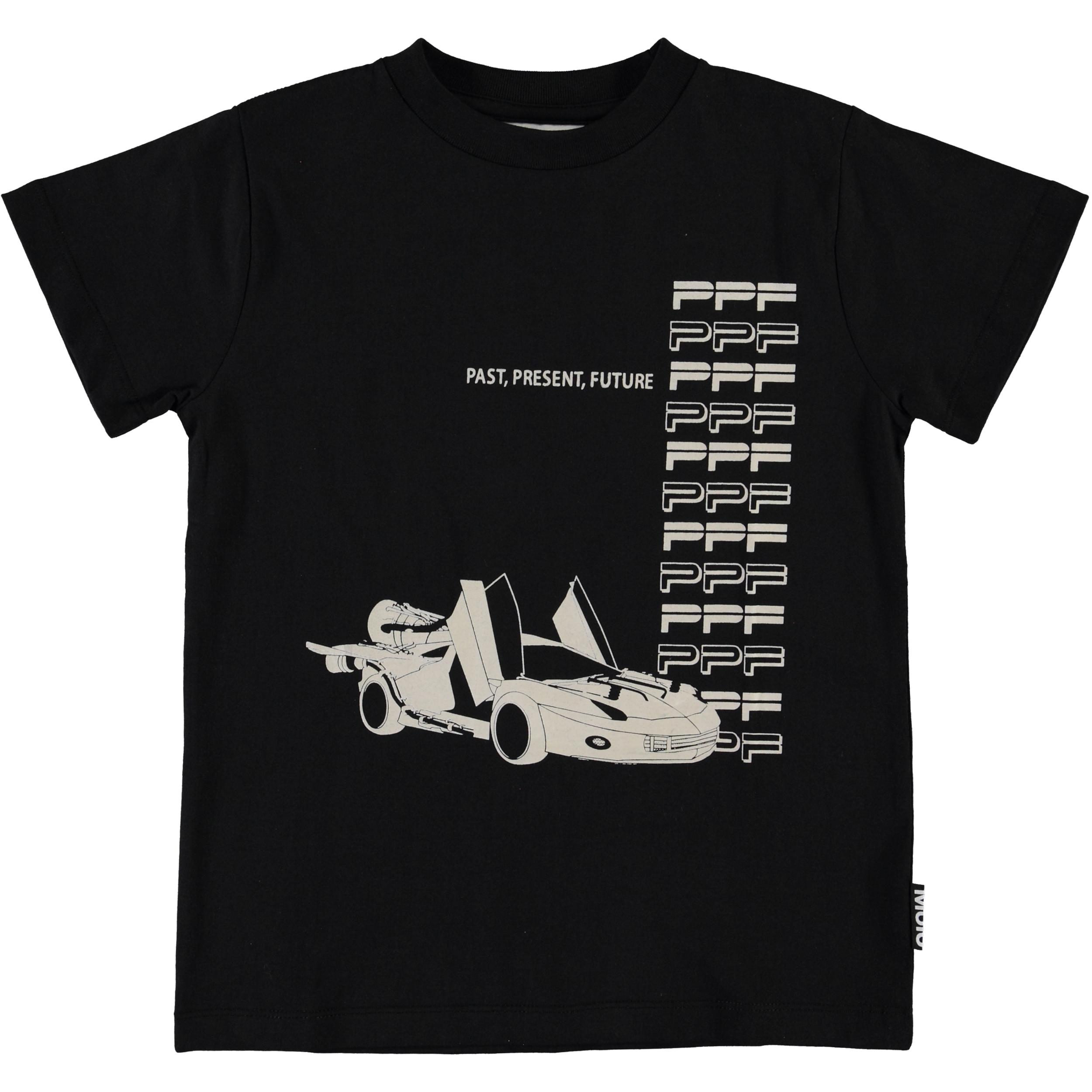 Road ist ein schwarzes T-Shirt mit einem schnellen Auto auf der Vorderseite und der Text 'Past, present, future'.