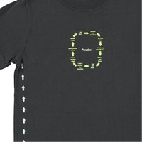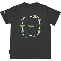 Road ist ein schwarzes T-Shirt mit dem Druck 'The Grandfather Paradox' auf der Vorderseite, in dem es darum geht, in die Vergangenheit zu reisen und was es für Folgen hat. Das T-Shirt hat auch Druck auf dem Rücken und den Ärmeln.
