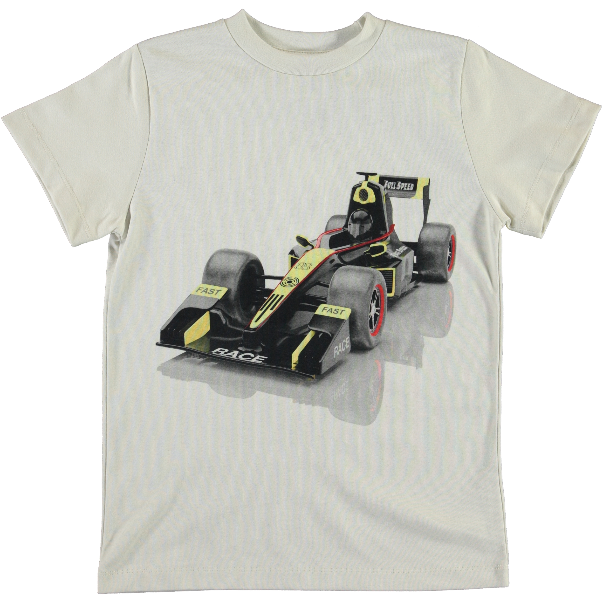 Road ist ein weißes T-Shirt mit dem Frontdruck eines Rennwagens.