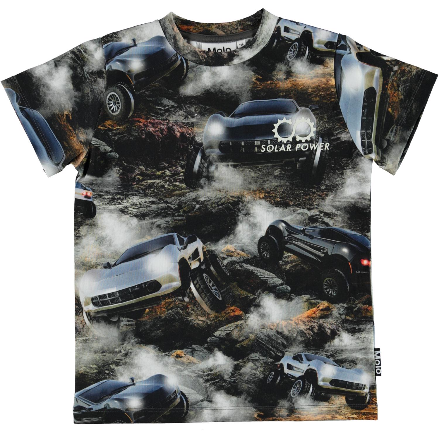 Road ist ein T-Shirt mit Aufdrucken von Geländewagen und dem Text 'Solar Power' auf der Brust.