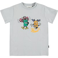 Road ist ein grau-blaues T-Shirt mit zwei Spraydosen, die breakdancen und Boombox hören.