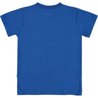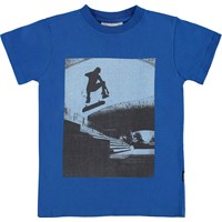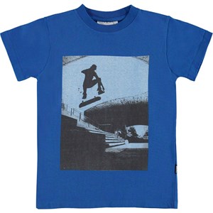 Road ist ein blaues T-Shirt mit einem Foto eines Skateboarders mitten im Sprung auf dem Bauch.